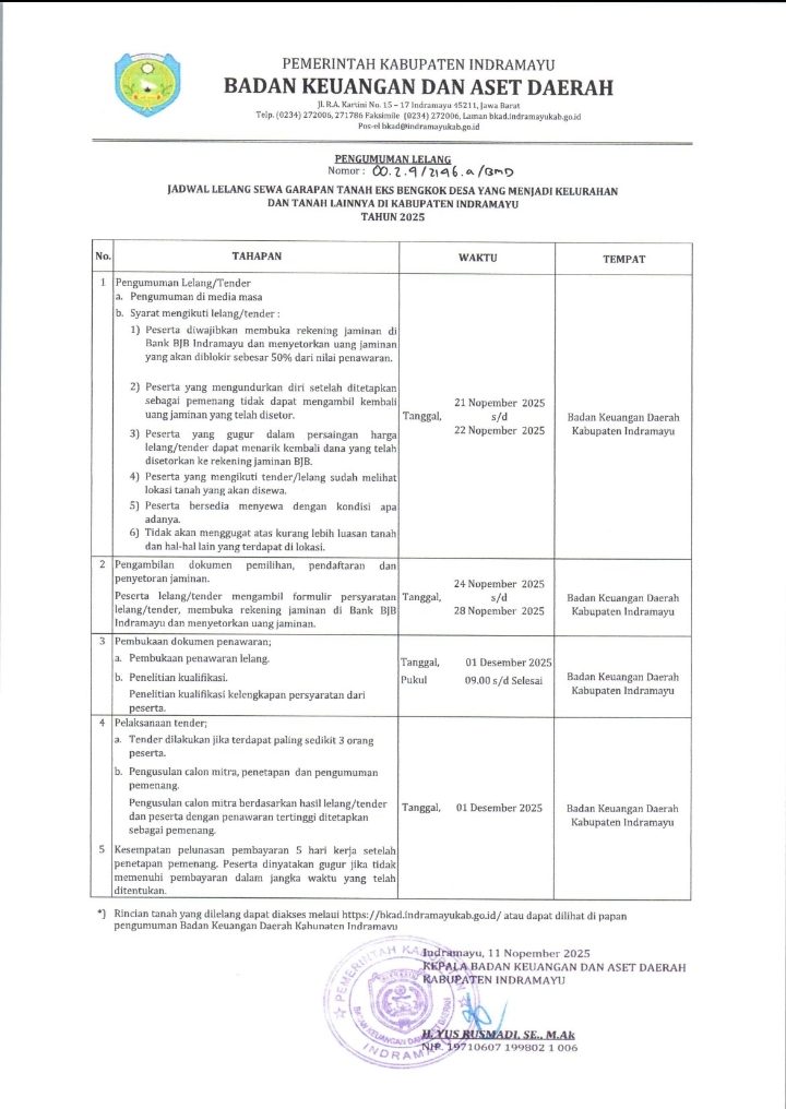 Badan Keuangan Daerah (BKD) Kabupaten Indramayu, Jawa Barat, resmi mengumumkan jadwal pelaksanaan lelang sewa garapan tanah eks bengkok pada wilayah desa yang telah berubah status menjadi kelurahan beserta tanah lainnya. Sabtu (22/11/2025).