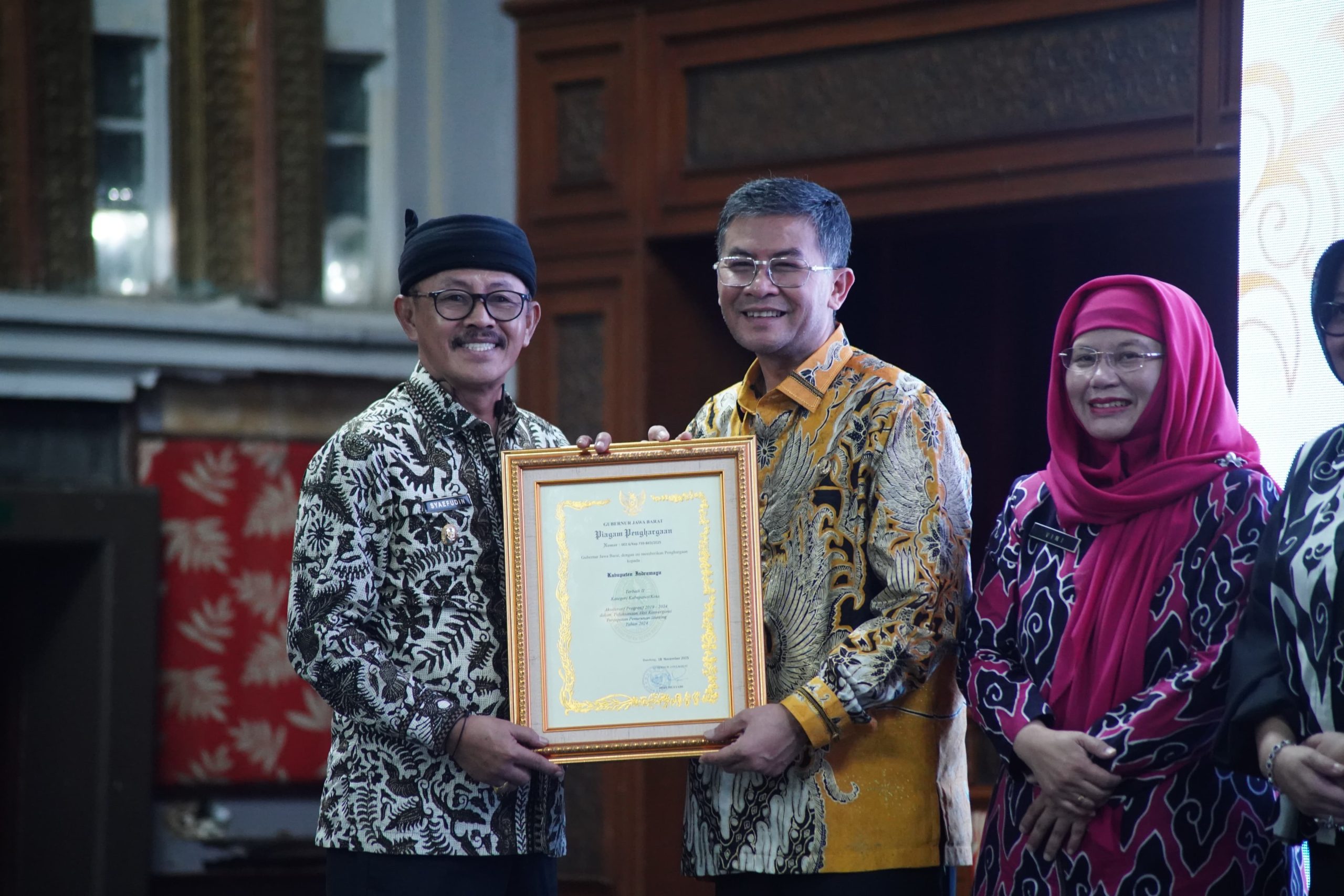 Penghargaan diserahkan Wakil Gubernur (Wagub)Jawa Barat, Erwan Setiawan, kepada Bupati Indramayu Lucky Hakim yang diwakili oleh Wakil Bupati (Wabup) Indramayu, H. Syaefudin, dalam Rapat Koordinasi Percepatan Pencegahan dan Penurunan Stunting seluruh jawa Barat di Pusdai, Bandung, Kamis (20/11/2025) yang lalu.